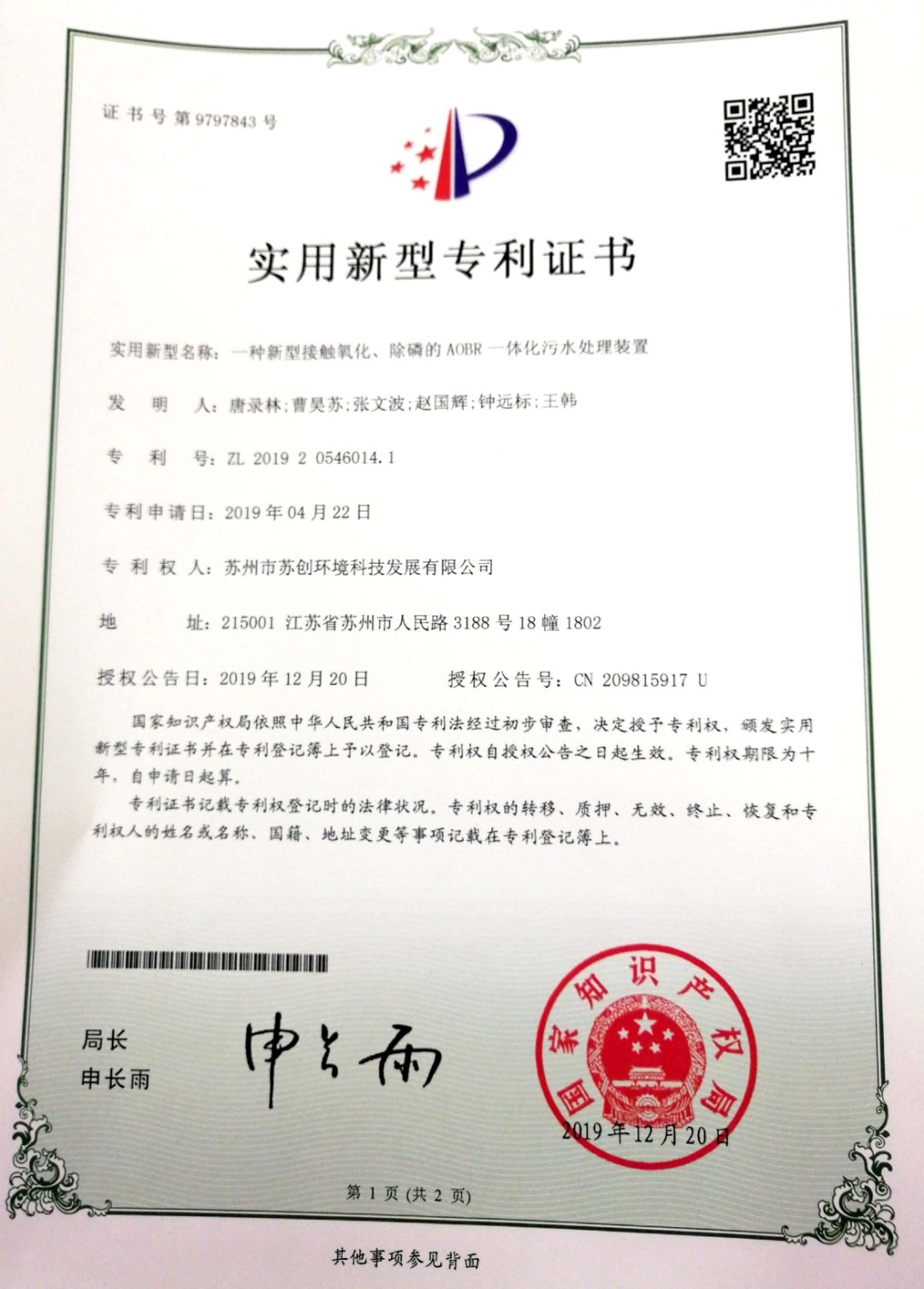 磁分離+反硝化+曝氣生物濾池一體化裝備 采用磁沉淀和曝氣生物濾池相結合的水體凈化工藝蘇創環境 · 專利與榮譽成果